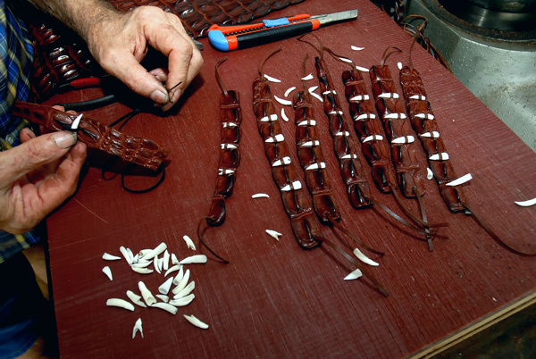 Crocodile leather “horn back” belts, wallets, hatbands, wrist straps and crocodile tooth necklaces..